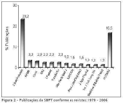 Com relação às revistas mais freqüentemente utilizadas para estas publicações, encontra-se o JBP (J Bras Pneumol - outrora Jornal de Pneumologia) com o maior percentual de publicações, 23,2%, seguido de percentuais de 3,3% até 1,2% para as outras revistas da área (Figura 2). Revistas internacionais de maior impacto como o Chest, European Respiratory Journal (ERJ) e American Journal of Respiratory and Critical Care Medicine (AJRCCM) ocuparam o 3o, 4o e 6o lugares, respectivamente. Na mesma posição do ERJ encontram-se o Jornal de Pediatria e o Pulmão (Rio de Janeiro), e na do MJRCC está o Brazilian Journal of Medical and Biological Research (Braz J Med Biol Res).