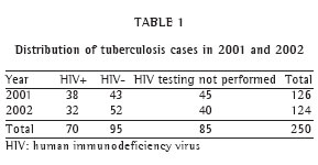 In the two years studied, a total of 250 TB cases were reported. Of those, 169 occurred in males. In 70 (42.4%) of the 165 cases submitted to HIV testing, TB-HIV co-infection was identified (Table 1). It is important to highlight that 85 (34%) of the patients were not submitted to this testing.