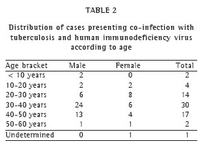 Objective: To discuss the main aspects of co-infection with Mycobacterium tuberculosis and human immunodeficiency virus in the city of Taubaté (located in the state of São Paulo, Brazil) in 2001 and 2002. Methods: This study presents epidemiological data on tuberculosis cases occurring in Taubaté in 2001 and 2002. Results: Of the 250 cases of tuberculosis analyzed, 70 (28%) presented human immunodeficiency virus seropositivity, 95 (38%) presented human immunodeficiency virus seronegativity, and 85 (34%) were patients who had not been submitted to serological testing. In the first group (tuberculosis and human immunodeficiency virus seropositivity), males from 30 to 40 years of age predominated, the most common clinical presentation of tuberculosis was pulmonary (65.71%), and the cure rate was 59.38%. In the group of tuberculosis patients presenting human immunodeficiency virus seronegativity, males from 30 to 40 years of age also predominated, the most common clinical presentation of tuberculosis was also pulmonary (70.55%), and the cure rate was 81.63%. Conclusion: We conclude that the human immunodeficiency virus plays an important role in the epidemiology of tuberculosis. Therefore, serological testing for human immunodeficiency virus should be carried out when a diagnosis of tuberculosis is made.