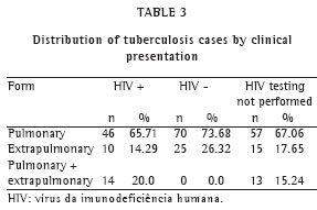 We observed that, in the various groups of patients studied, the pulmonary presentation of TB predominated. Among the patients presenting HIV seronegativity, no concomitance between the pulmonary and extrapulmonary clinical presentations of TB was observed. However, such concomitance occurred in 20% of the co-infected patients (Table 3).