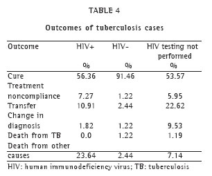 The outcomes of the TB cases can be seen in Table 4, where it can also be seen that the cure rate was lower among the co-infected patients. However, the cure rate was even lower among the patients who were not submitted to HIV testing.