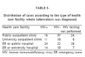 The diagnosis of TB was primarily made in public health care facilities, which were responsible for more than 80% of the diagnoses of all TB cases in the city of Taubaté. The principal health service was the emergency room or the public hospital. Table 5 shows the principal types of health care facilities in which a diagnosis of TB was made, collectively accounting for 83.6% of all reported cases.