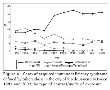 Figure 4 shows the evolution of the HIV-exposure category among the cases of AIDS accompanied by TB, reflecting the current significance of heterosexual exposure, principally from 1997 onward.