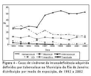 A Figura 4 representa a evolução da categoria de exposição ao HIV entre os casos de AIDS associados à TB, refletindo a importância atual da exposição heterossexual, observada, principalmente, a partir de 1997.