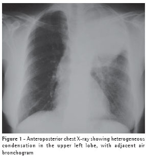 The physical examination revealed a good nutritional state, with normal respiration and no lymph node enlargement. In addition, there were no alterations in the neurological examination. The patient presented symmetric chest expansion, and auscultation revealed reduced vocal fremitus and breath sounds, together with underlying fluid density in the left apex upon percussion.