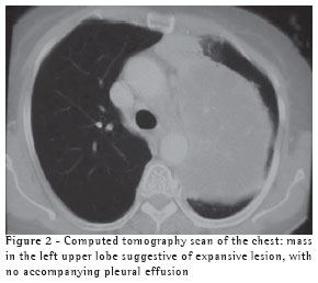 The computed tomography scan of the chest (Figure 2) confirmed the presence of a heterogeneous mass in the left upper lobe, with air bronchogram adjacent to the mass, suggesting an expansive neoplastic lesion. The patient was unable to produce a sputum sample for testing.