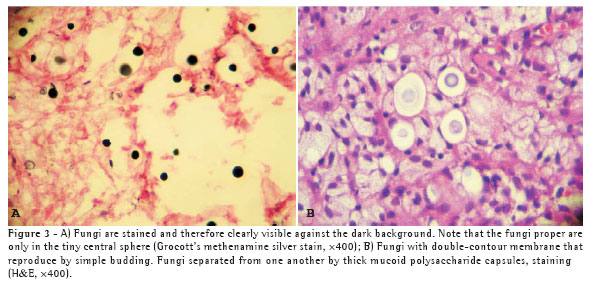 In the present study, the patient, being unable to provide a sputum sample for testing, presented positive direct testing in the bronchoalveolar lavage and in the transbronchial biopsy, with high titers in the serum and urine samples. The patient presented no clinical neurological involvement. However, since there were high titers in the serum serology, she was submitted to spinal tap with direct study and serology of the spinal fluid, the results of both of which were negative. Therefore, she was diagnosed with isolated pulmonary cryptococcosis.