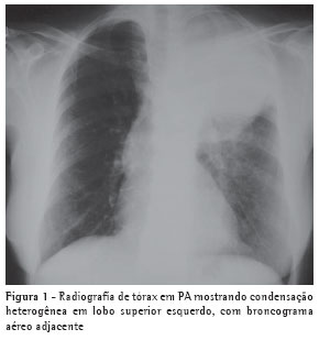 Uma mulher, de 69 anos, dona de casa, procedente de Montes Claros (MG), foi admitida no Hospital Universitário Clemente de Faria com quadro clínico iniciado havia 30 dias. Apresentava febre sem horário definido, calafrios, astenia, prostração, tosse oligoprodutiva com secreção mucoamarelada e perda de 7 kg nesse período. Teve episódios de hemoptóicos e dor torácica ventilatório-dependente, mais acentuada nas regiões infraclavicular e escapular esquerdas. Fez uso de antibióticos (amoxacilina, penicilina procaína e ceftriaxona) sem melhora do quadro.