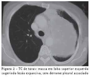 O radiograma torácico apresentava imagem densa, tipo massa, em lobo superior esquerdo (Figura 1). A tomografia computadorizada de tórax (Figura 2) confirmou a presença de massa heterogênea em lobo superior esquerdo, com broncograma aéreo adjacente à mesma, sugerindo lesão expansiva neoplásica. A paciente não conseguiu realizar coleta de escarro para exame devido à pequena quantidade de secreção.