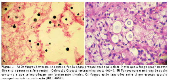 Visando ao diagnóstico específico, a paciente foi submetida a fibrobroncoscopia, e apresentou-se sem alterações endobrônquicas. A biópsia transbrônquica e o lavado broncoalveolar revelaram Cryptococcus neoformans (Figura 3), com pesquisas de bacilos álcool-acido resistentes e malignidade negativas.