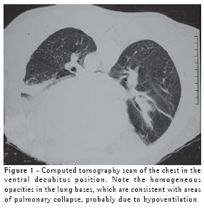 The chest X-ray revealed that the heart area was normal, the hemidiaphragm was elevated, and there were areas of bi-basal hypotransparency consistent with laminar atelectasis. The spirometry showed that forced vital capacity was 55% of predicted, forced expiratory volume in one second was 59% of predicted, and the mean ratio between forced expiratory volume in one second and forced vital capacity was 88%, none of which were altered after bronchodilator use. The chest X-ray revealed only areas of collapse in the lung bases, which were probably secondary to hypoventilation (Figure 1), and the angiotomography results were normal. The echocardiogram and electrocardiogram results were both normal.