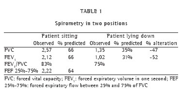 Physical examination revealed normal respiration at rest, becoming severe dyspnea when the patient assumed the supine position. Upon lying down, the patient immediately presented rapid, shallow respiration with paradoxical movement of the thorax and abdomen. There was no cyanosis or digital clubbing. Upon auscultation, it was noted that the lungs were clean with reduced breath sounds in the bases. The rest of the physical examination, including the neurological evaluation, revealed no alterations.