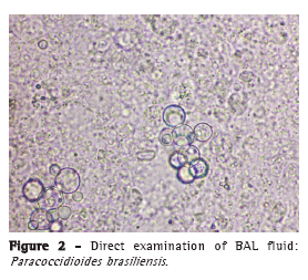 Paracoccidioidomycosis is a systemic fungal infection whose clinical manifestations are predominantly pulmonary and whose etiologic agent is the dimorphic fungus Paracoccidioides brasiliensis. Its geographic distribution is limited to Latin America, from Mexico to Argentina. Although it has sporadically been isolated from nature, its natural reservoir is unknown.(1) A small proportion of individuals develop clinical manifestations of disease. The incidence of paracoccidioidomycosis in Uruguay is unknown. Studies and personal communications have reported that 1 or 2 cases are diagnosed per year, and it is likely that the condition is underdiagnosed. It usually affects males and rural workers, especially farm workers and woodcutters.(2) Smoking has been reported as a risk factor for the development of the disease.(3) In culture media at 37°C, P. brasiliensis appears as spherical yeast surrounded by a refractive, double-contoured wall, formation of intracytoplasmic lipid inclusions being typically observed. It reproduces by multiple budding, in which blastoconidia are connected to a mother cell in an arrangement resembling a "ship's steering wheel", which gives it a particular morphological characteristic. At temperatures of less than 26°C, it develops as a mold. The major antigenic component of P. brasiliensis is a 43-kDa glycoprotein, which binds to the wall and participates in the adhesion, invasion, and pathogenesis of the fungus.(1,4) The fungus is acquired through inhalation of spores of the mycelial phase, which reach the lungs and readily convert to the yeast form, multiplying in the parenchyma and inducing a host response characterized by the formation of a primary complex, followed by the formation of granulomas. In this primary infection, systemic dissemination occurs via the hemolymphatic system. These fungi can remain dormant for years or progress to disease, depending on the host immune response.(3)