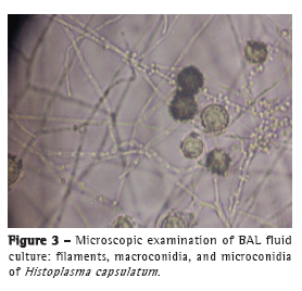 In the case reported here, the diagnosis was difficult because endemic deep fungal infections are uncommon in Uruguay. The clinical presentations of paracoccidioidomycosis and histoplasmosis depend on many factors that are related to the host, the host response, the parasite growth, and the environment. Respiratory involvement is common. It is of note that the case reported here involved an immunocompetent patient, who had severe and extensive lung involvement with a subacute clinical course, and that the diagnosis was confirmed by direct mycological examination, culture, and serological testing. Direct mycological examination revealed abundant multi-budding yeasts (10 to 30 microns in diameter) with refractive walls and vacuolar contents, findings that were consistent with the morphological characteristics of P. brasiliensis (Figure 2). Direct mycological examination with Gomori staining revealed yeasts that had the same characteristics as those described above. Sabouraud cultures (n = 6) maintained at 28°C for 4 weeks showed growth of P. brasiliensis and H. capsulatum, and the different culture tubes were identified on the basis of the micromorphology of the culture. Figure 3 shows the micromorphological pattern of the H. capsulatum colonies isolated. After the detection of both species of fungi on culture and given the fact that this is extremely rare, the stained slides were reexamined. The Giemsa-stained slides revealed the presence of very few yeasts characteristic of H. capsulatum, which had gone unnoticed in the first examination.