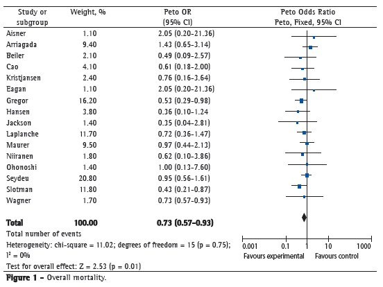 All 16 studies reported the impact of PCI on one-year mortality, totaling 1,983 patients (1,021 submitted to PCI and 962 who were not). Combining the data from the 16 studies, PCI was associated with a significant reduction in the overall mortality of patients with SCLC in comparison with that of those who did not undergo PCI (OR = 0.73; 95% CI: 0.57-0.97; p = 0.01), with a 4.4% reduction in overall mortality, i.e., for every 25 patients treated, one death is avoided (Figure 1). There was no heterogeneity across studies (p = 0.3), which demonstrates that the results are valid.