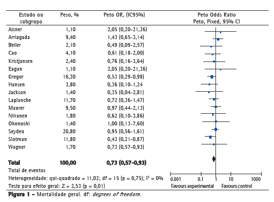 Todos os 16 estudos reportaram os resultados sobre mortalidade em um ano, resultando em 1.983 pacientes (1.021 submetidos a ICP e 962 sem ICP). Combinando-se os dados dos 16 estudos, a ICP foi associada com uma redução significativa na mortalidade geral dos pacientes com CPPC, quando comparados com os pacientes sem ICP (OR = 0,73; IC95%: 0,57-0,97; p = 0,01), com uma redução absoluta na mortalidade de 4,4%, ou seja, para cada 25 pacientes tratados, evita-se uma morte (Figura 1). Não houve heterogeneidade através dos estudos (p = 0,3), demonstrando que os resultados são válidos.