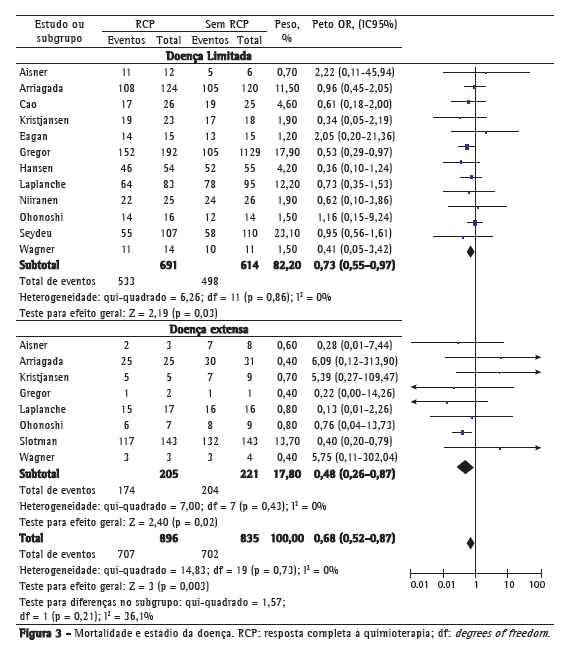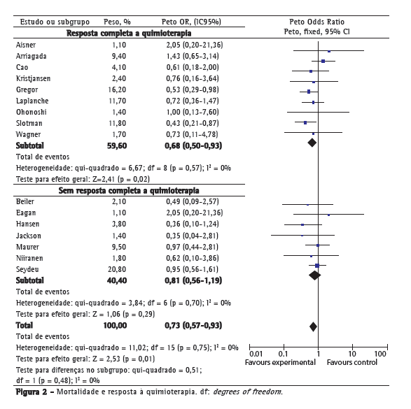 Uma análise de subgrupo foi realizada para se avaliar o impacto da resposta à quimioterapia sobre a mortalidade. Desse modo, os resultados foram estratificados de acordo com a avaliação da resposta a quimioterapia, gerando dois grupos: aquele com resposta completa à quimioterapia e aquele sem resposta à quimioterapia. A análise de subgrupos identificou que os pacientes com resposta à quimioterapia (1.320 pacientes em 9 estudos) se beneficiaram do uso da ICP (OR = 0,68; IC95%: 0,50-0,93; p = 0,02), com uma redução absoluta na mortalidade de 5%, ou seja, para cada 20 pacientes tratados, evita-se uma morte (Figura 2). Por outro lado, não houve qualquer benefício da ICP para os pacientes sem resposta a quimioterapia (663 pacientes em 7 estudos; OR = 0,81; IC95%: 0,56-1,19; p = 0,29). Não houve heterogeneidade através dos estudos (p = 0,57), demonstrando que os resultados são válidos.