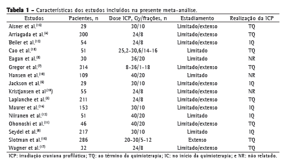 Um total de 16 ECRs,(4-19) publicados entre 1977 e 2007, foram considerados elegíveis para a inclusão no presente estudo. Suas principais características estão resumidas na Tabela 1. O número total de pacientes elegíveis incluídos foi de 1.983, com 1.021 pacientes randomizados para o grupo ICP e 962 pacientes para o grupo controle. Em 7 estudos (894 pacientes),(4,5,7,11,15) foi avaliado o papel da ICP em pacientes que tiveram uma resposta completa após a quimioterapia de indução. Em 5 estudos,(6,9,12-14) foi avaliado o papel da ICP administrada no início da quimioterapia de indução em pacientes considerados como livres de metástases cerebrais. Em 7 estudos (894 pacientes),(4,5,7,11,15) foi avaliado o papel da ICP em pacientes que a receberam durante a quimioterapia de indução. Em 2 estudos,(6,8) a ICP foi dada como tratamento de consolidação no final da quimioterapia, antes da avaliação da resposta. Em 10 estudos,(4-6,11,12,14,15) foram incluídos pacientes independentemente do estadiamento da doença (local ou extensa).(6-9,13) Por outro lado, em 6 estudos, foram incluídos somente pacientes com doença limitada, enquanto, em apenas 1 estudo, foram incluídos somente aqueles com doença extensa.(16)