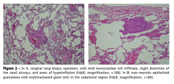 According to the literature, few patients have undergone surgical lung biopsy.(9) Such patients have been characterized as having bronchiolitis obliterans or constrictive bronchiolitis, bronchiolar inflammation and fibrosis being present. Granulomas, found in the patient who underwent biopsy, have been observed in some cases,(2,5) leading pathologists to the diagnosis of granulomatous bronchiolitis or hypersensitivity pneumonitis. However, no other findings suggestive of hypersensitivity pneumonitis, such as evidence of pulmonary restriction, progression to fibrosis, and response to systemic corticosteroids, have been reported in the cases in the literature,(9) which is consistent with our own findings.