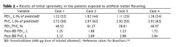 In conclusion, we reported, for the first time in Brazil, four cases of bronchiolitis secondary to inhalation of artificial flavoring agents in workers at a cookie factory. Bronchiolitis resulting from exposure to artificial flavoring agents should be included in the differential diagnosis of airflow obstruction in workers in Brazil.
