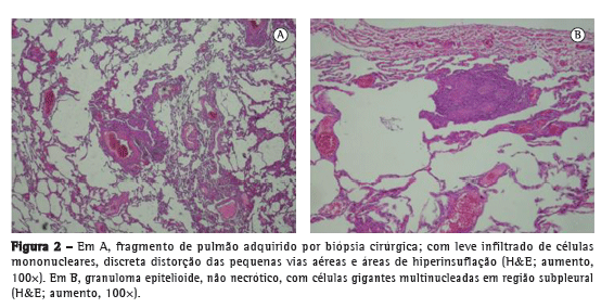 Foi realizada biópsia pulmonar a céu aberto em um dos casos (caso 1), que evidenciou padrão de bronquiolite obliterante, caracterizada por leve distorção das pequenas vias aéreas com hiperplasia da musculatura lisa da parede, discreto infiltrado linfomononuclear; além de áreas de aprisionamento aéreo e hiperinsuflação (Figura 2A). Em região subpleural, identificou-se granuloma epitelioide isolado, não necrótico e com presença de células gigantes multinucleadas (Figura 2B).