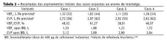 ResultadosQuatro jovens do sexo masculino, previamente hígidos, não tabagistas, com idade entre 24 e 27 anos na ocasião da primeira consulta, que trabalhavam numa fábrica de biscoitos no Recife, tiveram exposição ao aroma de manteiga - diacetil (2,3-butanodiona) - por períodos que variaram de 1-3 anos. Todos trabalhavam no preparo da massa do biscoito, que constava de uma mistura contendo o aroma artificial de manteiga, gordura vegetal, farinha de trigo, açúcar, entre outros ingredientes, sem aquecimento. Todos referiam forte cheiro ao manusear o aroma artificial de manteiga e nenhum deles usava equipamentos de proteção individual, tais como máscaras, contrariando a recomendação existente no rótulo do produto.