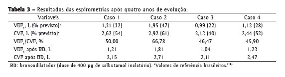 Na espirometria inicial, todos os pacientes apresentaram padrão obstrutivo de grau moderado a acentuado, com redução da CVF (Tabela 2). Dois casos apresentaram respostas significativas ao salbutamol inalado (casos 1 e 4). Nas espirometrias realizadas 4 anos mais tarde, observou-se a persistência do padrão de obstrução ao fluxo aéreo (Tabela 3). Não foram realizadas as determinações de CPT e de DLCO pela indisponibilidade dos equipamentos necessários para tanto em nossa região.