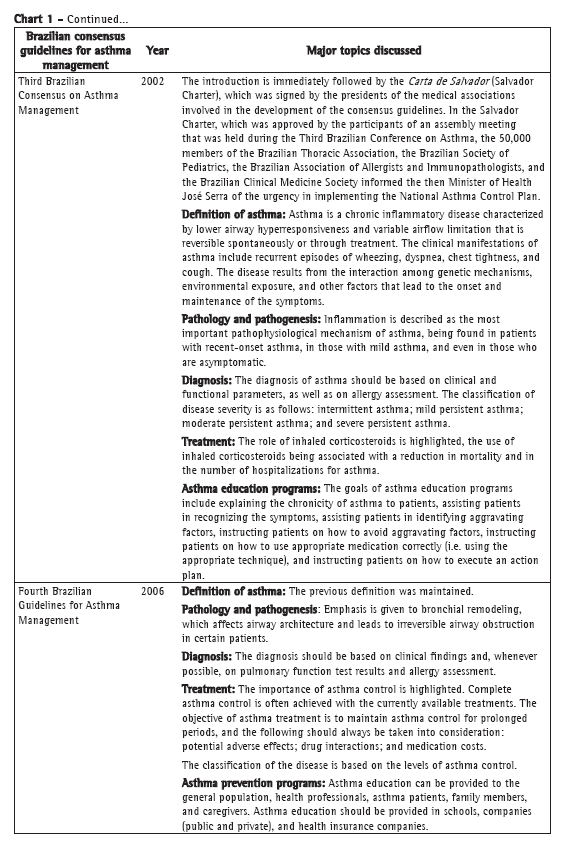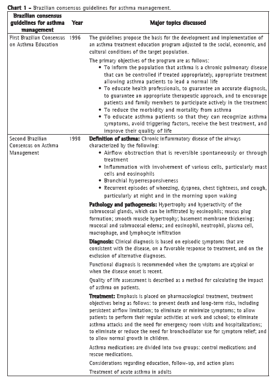 In 1996, the Brazilian Thoracic Association, the Brazilian Association of Allergists and Immunopathologists, and the Brazilian Society of Pediatrics published the First Brazilian Consensus on Asthma Education,(4) drawing a plan for asthma education and control. Chart 1 summarizes the issues addressed in the Brazilian consensus guidelines for asthma.