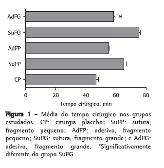 ResultadosO tempo cirúrgico no grupo CP (48,0 ± 4,0 min) foi significativamente mais curto do que em todos os outros grupos. O tempo cirúrgico também foi significativamente mais curto no grupo SuFP que no grupo SuFG (65,0 ± 6,2 min vs. 75,0 ± 4,78 min; Figura 1). Entretanto, não houve diferença entre os grupos AdFP e AdFG (55,0 ± 3,2 min e 58,0 ± 4,0 min, respectivamente).