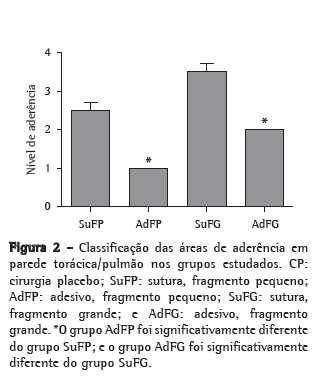 Áreas de aderência na parede torácica foram identificadas em todos os animais, sendo consideradas uma consequência natural da hipóxia causada pela incisão e pelos procedimentos empregados para se obter hemostasia. As aderências eram mais graves nos grupos SuFP e SuFG que nos grupos AdFP e AdFG. Nos dois primeiros grupos, as aderências foram atribuídas à lesão isquêmica tecidual causada pelo procedimento cirúrgico e à presença do fio de sutura absorvível. Nos dois últimos grupos, as aderências podem estar relacionadas à toxicidade dos subprodutos da degradação do cianoacrilato.(11,23) Embora a presença de resíduos tóxicos 14 dias após a cirurgia tenha sido relatada anteriormente,(21) não se encontrou nenhum resíduo do adesivo 30 dias após a cirurgia no presente estudo. As reações inflamatórias observadas durante o exame histopatológico dos fragmentos pulmonares foram mais intensas e numerosas nos animais submetidos à sutura convencional com fio absorvível. Embora também tenhamos encontrado reações inflamatórias nos animais tratados com o adesivo tecidual, elas foram menos intensas. As reações inflamatórias podem ter ocorrido em razão da toxicidade dos subprodutos da degradação do cianoacrilato e ao aquecimento intenso durante o processo de polimerização.(10,11,21) Além disso, a quantidade de tecido vascular no parênquima pulmonar deve ser levada em consideração, pois a resposta inflamatória é proporcional a ela.(20)
