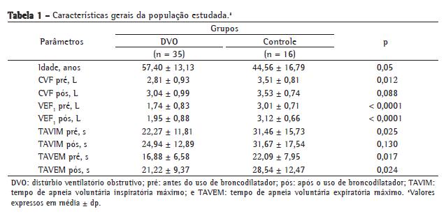 Os pacientes dos grupos DVO e controle tiveram uma média de idade de 57,4 ± 13,1 anos e 44,6 ± 16,8 anos, respectivamente (p = 0,05). A prevalência de tabagismo foi maior no grupo DVO que no grupo controle (62,9% vs. 31,3%; p = 0,004). O TAVIM antes do uso de broncodilatador foi menor no grupo DVO que no grupo controle (22,27 ± 11,81 s vs. 31,45 ± 15,73 s; p = 0,025). Não houve diferença estatisticamente significativa entre os grupos em relação ao TAVIM após o uso de broncodilatador.