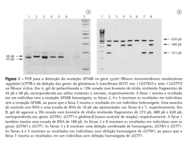 O DNA genômico de sangue periférico foi utilizado para a genotipagem de todos os pacientes com FC. A mutação F508 do gene CFTR foi detectada diretamente por PCR (Figura 1A).(19) As mutações G542X, G551D, R553X, R1162X, W1282X e N1303K do gene CFTR foram analisadas por digestão dos produtos da PCR com endonuclease de restrição.(20) Os genes GSTM1, GSTT1 e globina (como controle de reação) foram amplificados por PCR múltipla (Figura 1B).(21)