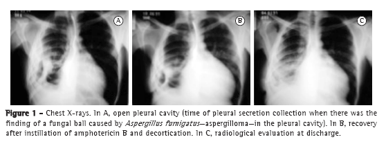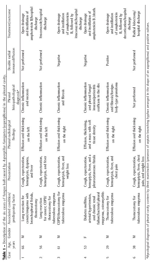 In rare cases, an aspergilloma can be located in the pleural space, being usually subsequent to surgical complications or concomitant with the presence of a bronchopleural fistula.(10-18) The objective of the present study was to report and document cases of patients with pleural aspergilloma caused by Aspergillus fumigatus, determining the profile of those patients, and therefore to assist in raising clinical suspicion.