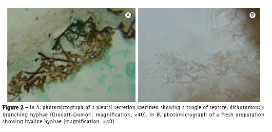 The fungal etiology of an empyema diagnosed by the presence of purulent fluid in the pleural cavity will be established on the basis of the following criteria: isolation of the fungus from an exudate; significant signs of infection, such as fever (body temperature > 38 °C) and leukocytosis (> 10,000 cells/µL); and isolation of the same agent from the pleural specimen in more than one occasion, or also from blood, sputum, or surgical wounds showing tissue invasion.(21,23) Invasion of the pleural cavity by Aspergillus sp. is uncommon and usually results from a late complication: chronic empyema treated with thoracostomy or pneumothorax, this empyema being associated with bronchopleural fistula, previous pulmonary tuberculosis, cavernostomy, or complications of invasive aspergillosis.(11,20)