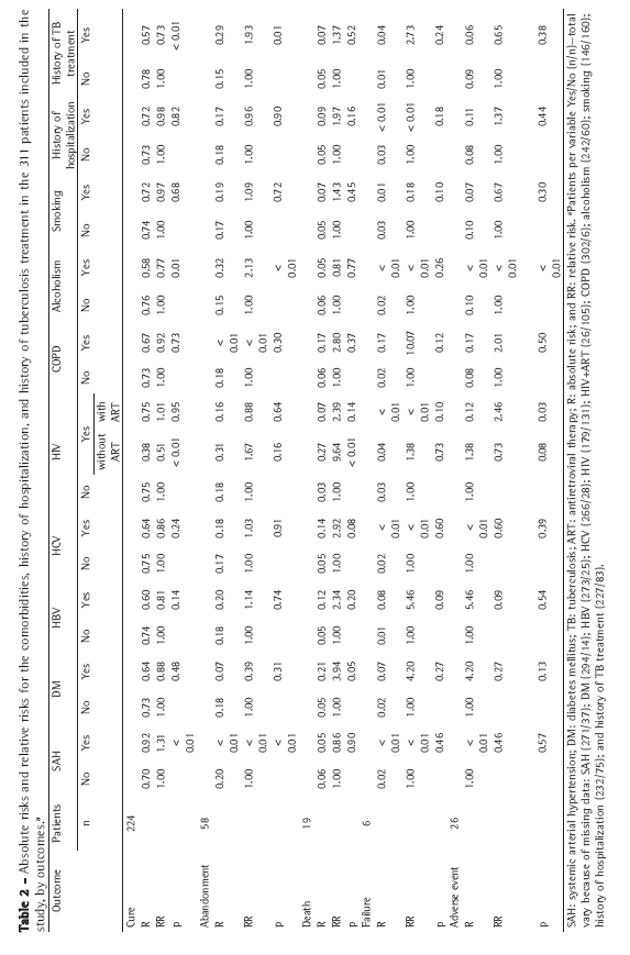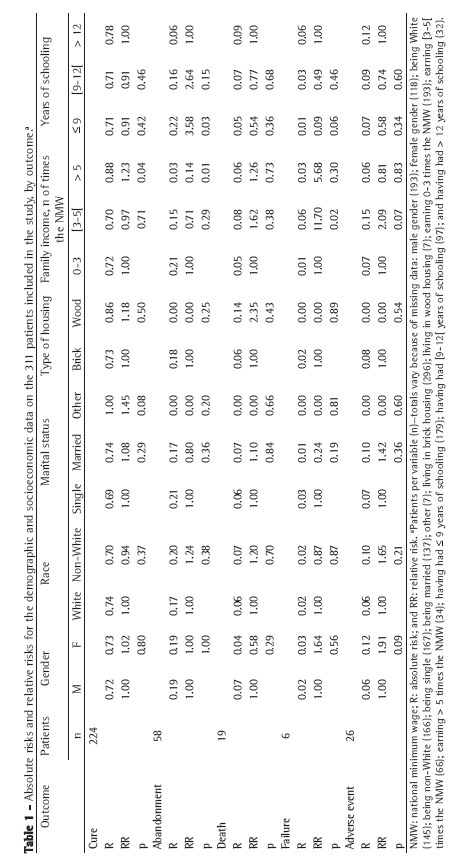 The present study has some limitations. The reduced number of some exposures and some outcomes did not allow the evaluation of factors independently predictive of outcomes. In addition, the lack of information on CD4 lymphocyte counts in individuals living with HIV/AIDS did not allow the evaluation of 'being immunosuppressed' as one of the predictor variables. However, the study confirms, in an underprivileged population, the relevance of the treatment regimen for tuberculosis and AIDS, as well as the relevance of social determinants in tuberculosis treatment outcomes in Brazil.