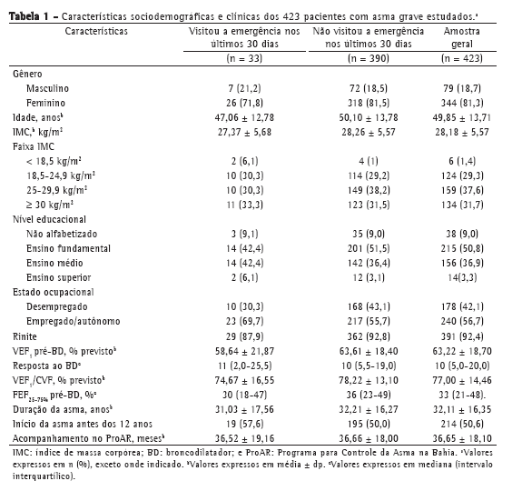 Uma das limitações do presente estudo foi utilizar uma amostra de conveniência de pacientes admitidos em um programa para controle da asma em um centro urbano. Usualmente, os pacientes que frequentam ambulatórios podem ser mais assíduos ao tratamento e melhor controlados. Pacientes não controlados podem ser mais ausentes dos ambulatórios e frequentar mais as emergências. Todavia, o ProAR é um programa de referência para atendimento da asma grave na Bahia, e os pacientes são referenciados a partir das principais emergências e por médicos especialistas da cidade de Salvador. Em dois estudos realizados em pacientes do ProAR, observamos boa aderência ao tratamento (> 80%)(27) e boa técnica no uso dos dispositivos inalatórios(30) entre os pacientes acompanhados no programa.