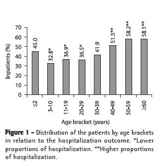 In the statistical analysis, we sought to compare the hospitalization rates in the patients, who were categorized by the presence or absence of each of the study variables. Categorical variables were compared by the chi-square test, and continuous variables were compared by the Student's t-test. The Z-test was used for determining the proportion of distribution of the variables in each group (inpatients and outpatients). Risk factors for hospitalization were identified by logistic regression analysis, and OR and 95% CI were used as the measure of association. This analysis included the variables that were significant in relation to hospitalization and that showed the highest proportions of this outcome according to the Z-test. The Kaplan-Meier method was used for comparing survival between the inpatients and outpatients who died. Statistical analyses were performed with the Statistical Package for the Social Sciences, version 17.0 (SPSS Inc., Chicago, IL, USA), and values of p < 0.05 were considered significant.