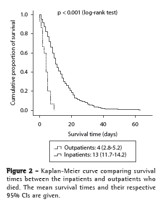 The death outcome was significantly more common among the inpatients. However, the Kaplan-Meier curve of the patients who died revealed that the inpatients had higher survival times than did the outpatients. This result suggests that the intensity of care provided to the severe cases that were hospitalized contributed to a significant increase in survival (Figure 2). The increase in survival times observed among the inpatients can allow the adoption of measures to improve the prognosis for cure of patients exhibiting a worsening of the clinical profile.