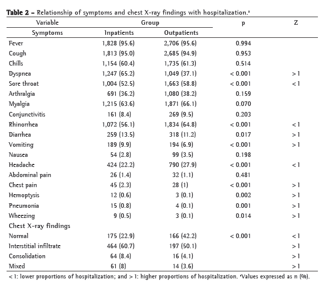 Diarrhea and pneumonia were the most common clinical manifestations of the infection, whereas dyspnea, vomiting, chest pain, hemoptysis, and wheezing were the most common symptoms. All of these clinical manifestations and symptoms showed significant relationships with the hospitalization outcome, occurring in greater proportion among the inpatients. The symptoms headache and sore throat occurred in greater proportion among the patients who did not require hospitalization. In addition, the chest X-ray findings obtained during the investigation of the disease showed a direct relationship with hospitalization. The hospitalization rates were higher among the patients who presented with radiological abnormalities than among those whose X-ray findings were normal.