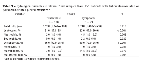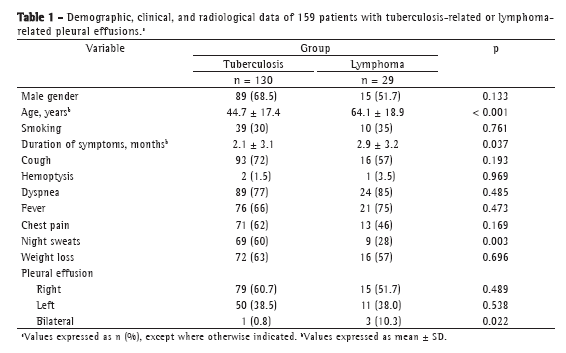 In this context, the objective of the present study was to describe clinical and laboratory characteristics in patients with tuberculosis-related or lymphoma-related lymphocytic pleural effusions, in order to identify the variables that might contribute to differentiating between these diseases.