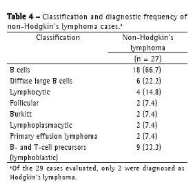 According to the literature, the sensitivity of pleural cytology in the diagnosis of lymphomatous pleural effusion ranges from 40% to 87%.(2) According to Billingham et al.,(25) exfoliative cytology represents an excellent method for diagnosing the condition, with an accuracy that is similar to that of histological examination. Santos et al.(26) evaluated 256 serous effusions (pleural or ascitic fluid) associated with lymphomas. Of the 197 pleural effusions tested, cytology results were positive in 52.7%, suspicious in 3.9%, and negative in 43.4%. Although Das et al.(27) found a high positivity in cases of non-Hodgkin's lymphomas (16/17; 94%), Celikoglu et al.(28) reported positive results in only two cases of a series of 26 pleural effusion samples. In our study, we obtained positive results in 51.8%, a result that is similar to those reported by Santos et al.(26) However, if we add to that the cases that were considered suspicious and whose diagnosis was confirmed by histology or by immunophenotyping, our positivity rate increases to 75.9%, if we consider all of the patients with lymphoma, and to 81.5% if we consider only those with non-Hodgkin's lymphomas. It is of note that the use of hematologic staining for cytological examination facilitates the identification of malignant lymphoid cells, mainly the high-grade subtypes.(13) The combined use of lymphocyte immunophenotyping and pleural fluid cytology greatly contributes to the diagnosis of lymphoma. In the present study, there was a predominance of mature B-cell lymphomas, which are easily identified by that method.