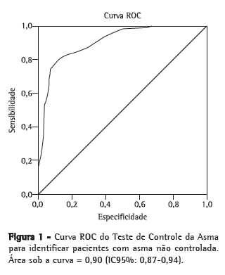 Os resultados apresentados neste estudo demonstram que o ACT, traduzido para o português, teve boa capacidade de discriminar asma controlada de asma não controlada neste grupo de pacientes no Brasil. A sensibilidade (93%) indica a proporção dos pacientes com asma não controlada que tiveram o teste positivo (de acordo com o ponto de corte pré-estabelecido). Testes sensíveis são úteis em programas de rastreamento do controle da asma na prática clínica ou em pesquisa para identificar pacientes que necessitam de uma melhor atenção em relação à sua doença, devendo ser investigados quanto às causas do descontrole da asma. A especificidade foi alta (74%) neste estudo, indicando a proporção de pacientes com asma controlada que foram identificados por um teste negativo (escore abaixo do ponto de corte).