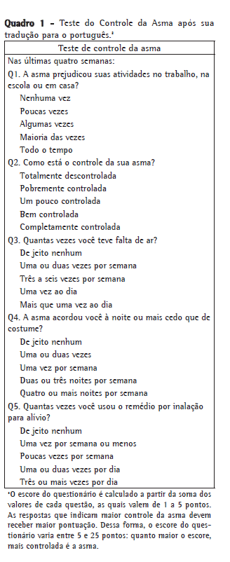 A má percepção do controle da asma pelo paciente pode levar à avaliação inadequada da asma pelo médico e, consequentemente, ao tratamento insuficiente ou excessivo.(5-7) Para suprir essa deficiência no gerenciamento do controle da asma, são necessários questionários para a avaliação de sintomas que reflitam a natureza multidimensional da doença e que sejam facilmente administrados e interpretados.(14,15)