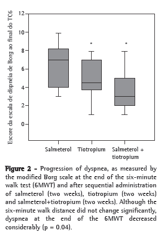 Salmeterol and tiotropium have been compared in longer studies.(22,23) In general, those studies suggest that the bronchodilator and clinical response produced by tiotropium are slightly superior but of little clinical significance. As a consequence, recent guidelines suggest that symptomatic patients with COPD should be initially treated with a long-acting ­bronchodilator in isolation and that there is insufficient evidence to recommend one drug over the other.(24) Our findings allow us to infer that patients who continue to have class III to IV dyspnea, as measured by the MRC scale, despite the use of β2 agonists, can benefit from the use of tiotropium in isolation. More recently, the combination of these two drugs has been evaluated. In a one-year study of 449 patients, it was demonstrated that adding tiotropium to the salmeterol-fluticasone combination had a beneficial effect on quality of life, pulmonary function and hospital admission rates, when compared with the use of tiotropium in isolation.(25)