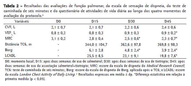 A dispneia, avaliada pela escala MRC, apresentou redução gradual em todas as visitas. Não houve uma diferença estatística significativa dos valores médios da escala entre D0 e D15 (3,06 vs. 2,83). Após a introdução de tiotrópio, essa média caiu para 2,50 em D30 (p < 0,05) e, em D45, com o uso de salmeterol e tiotrópio, essa foi de 2,26, uma redução estatisticamente significativa em relação à medida basal (p < 0,05).