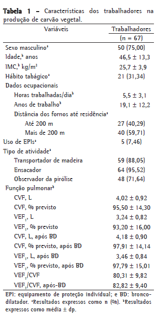 Objetivo: Determinar a ocorrência de sintomas respiratórios e tabagismo, assim como parâmetros de função pulmonar, em trabalhadores da produção de carvão vegetal em três municípios do sul do Brasil. Métodos: Estudo do tipo observacional com 67 indivíduos, no qual os dados foram obtidos através de entrevistas e espirometria. Resultados: Do total de 67 trabalhadores, 50 (75,0%) eram homens; média de idade = 46,52 ± 13,25 anos; média de IMC = 25,7 ± 3,85 kg/m2; VEF1 = 3,24 ± 0,82 L (93,2 ± 16,0% do previsto); CVF = 4,02 ± 0,92 L (95,5 ± 14,3% do previsto); e VEF1/CVF = 80,31 ± 9,82. Os sintomas de vias aéreas superiores mais frequentes foram espirros e secreção nasal, em 24 trabalhadores (35,82%), enquanto o das vias aéreas inferiores foi tosse, em 15 (22,38%). Dos 67 trabalhadores, 21 (31,34%) eram tabagistas. Os tabagistas apresentaram mais tosse (OR = 5,00; p = 0,01), obstrução nasal (OR = 3,50; p = 0,03), prurido nasal (OR = 8,80; p = 0,01) e sibilância (OR = 10,0; p = 0,03), assim como menor VEF1 (2,93 ± 0,80 L vs. 3,38 ± 0,80 L; p = 0,04) que os não tabagistas. Rinite ocupacional foi detectada em 14 trabalhadores (20,85%), asma brônquica em 4 (5,97%) e DPOC em 4 (5,97%). Conclusões: A ocorrência dos sintomas respiratórios e a redução do fluxo aéreo foram maiores nos trabalhadores tabagistas. O controle da pirólise não aumentou a ocorrência de sintomas respiratórios nos trabalhadores de carvoarias.