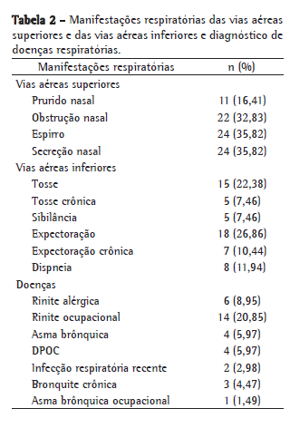 A Tabela 2 apresenta a ocorrência dos sintomas respiratórios nos produtores de carvão vegetal segundo o comprometimento de vias aéreas superiores e inferiores, assim como as possíveis doenças diagnosticadas. Dos 67 indivíduos estudados, a presença de espirros e secreção nasal foram os sintomas mais frequentes das vias aéreas superiores, ocorrendo em 35,82% dos trabalhadores. Quando perguntados sobre a presença de sintomas respiratórios das vias aéreas inferiores, a tosse, a expectoração e a dispneia foram os sintomas mais relatados (22,38%, 26,86% e 11,94%, respectivamente). O diagnóstico de doença respiratória realizada com base na história clínica e na função pulmonar avaliada por espirometria demonstrou que as doenças mais frequentes nos trabalhadores de carvoarias foram à rinite ocupacional (20,85% da amostra), seguida de rinite alérgica (8,95%), asma brônquica e DPOC, essas últimas encontradas em 5,97% dos trabalhadores. O único indivíduo com asma ocupacional era tabagista, bem como os 4 indivíduos portadores de DPOC e os 3 trabalhadores com diagnóstico clínico de bronquite crônica.