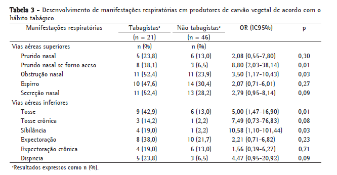 Dentre os carvoeiros investigados no presente estudo, um terço da amostra foi exposta à fumaça de tabaco em alguma ocasião de suas vidas (31,34%), incluindo tabagistas e ex-tabagistas. Os trabalhadores expostos ao tabagismo apresentaram mais prurido nasal com os fornos acesos, tosse, obstrução nasal e sibilância quando comparados aos que nunca haviam fumado (Tabela 3). Em um estudo feito com trabalhadores de grãos em algumas cidades do Canadá, indivíduos tabagistas apresentaram maior chance de desenvolver tosse, expectoração, sibilância e dispneia em comparação aos trabalhadores não tabagistas. Naquele mesmo estudo, indivíduos ex-tabagistas apresentavam maior chance de desenvolver expectoração, dispneia e sibilância do que trabalhadores não tabagistas.(9) Na Croácia, trabalhadores expostos à poeira do tabaco em plantações de fumo e que também eram fumantes apresentaram maior ocorrência de sibilância e secreção nasal que os não fumantes.(19) O mesmo tipo de efeito aditivo foi detectado em bombeiros nos EUA, uma vez que os fumantes apresentaram maior ocorrência de tosse e de expectoração do que os bombeiros não fumantes.(20)