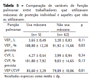 Os carvoeiros que utilizavam máscaras de proteção apresentaram menor redução de VEF1 % do previsto (p = 0,03) e da relação VEF1/CVF (p = 0,01) quando comparados aos carvoeiros que não as utilizavam (Tabela 5).