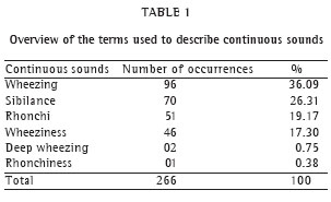 As for the continuous sounds, the situation is less alarming. Although the ILSA proposed only 2 terms to describe continuous sounds (wheezing and rhonchi), 6 different terms were used. Previous studies have obtained similar results.(10-11) The fact that there was a greater degree of appropriateness among the terms used to describe continuous sounds than among those used to describe intermittent sounds might be related to the fact that continuous sounds are easier to distinguish. Rhonchi are deep sounds (of lower frequency) and wheezes are high sounds (of higher frequency).